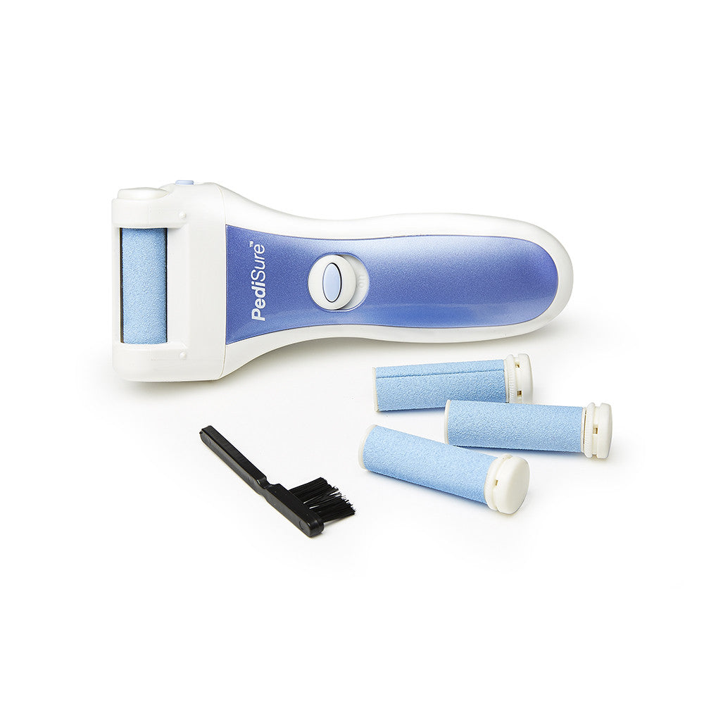 Spinning at over 30 times per second (1800rpm), the battery-operated PediSure has been designed to be both faster and safer than traditional metal blades and scrapers, and is included with 4 extra coarse mineral buffing rollers and a cleaning brush to ensure effective and professional pedicure results over and over again.
